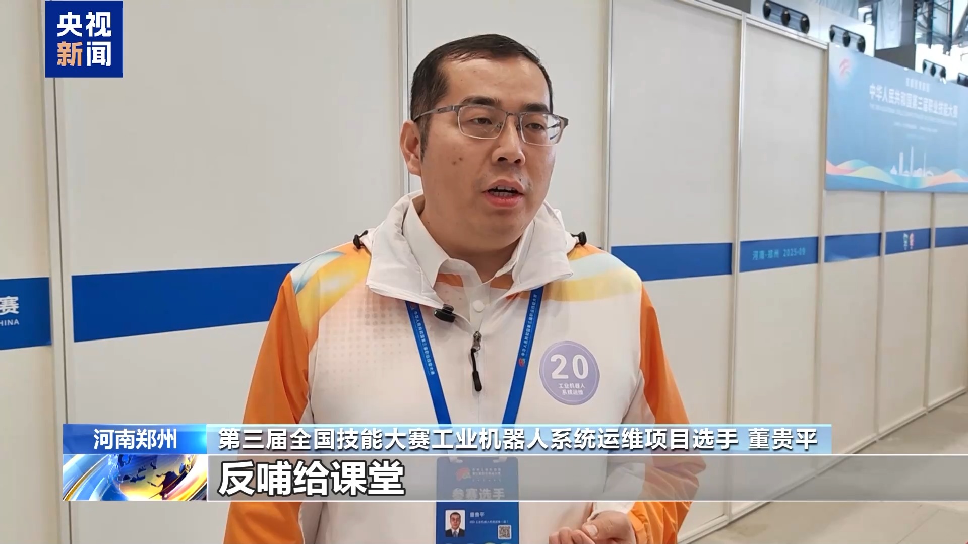 第三屆全國技能大賽工業(yè)機(jī)器人系統(tǒng)運(yùn)維項目選手 董貴平:能夠把學(xué)到的一些實(shí)操技能以及理論知識,反哺給課堂,提升學(xué)生的理論儲備以及實(shí)操的技能。