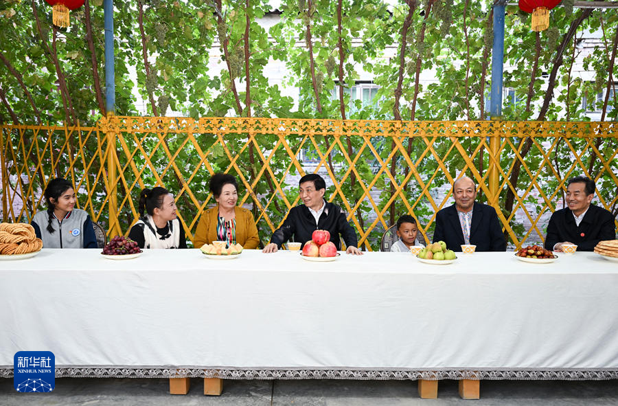9月25日下午,受習(xí)近平總書記囑托,中共中央政治局常委、全國政協(xié)主席、中央代表團(tuán)團(tuán)長王滬寧帶領(lǐng)中央代表團(tuán)部分成員在巴音郭楞蒙古自治州庫爾勒市看望慰問當(dāng)?shù)馗髯甯刹咳罕姟_@是王滬寧和中央代表團(tuán)部分成員在庫爾勒市阿瓦提鄉(xiāng)吾夏克鐵熱克村了解鄉(xiāng)村產(chǎn)業(yè)發(fā)展和群眾生產(chǎn)生活情況。新華社記者 張領(lǐng) 攝