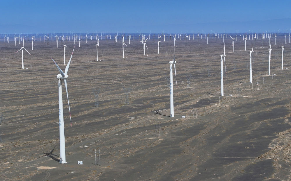 在新疆哈密地區(qū)巴里坤哈薩克自治縣拍攝的三塘湖風電場(4月27日攝,無人機照片)。