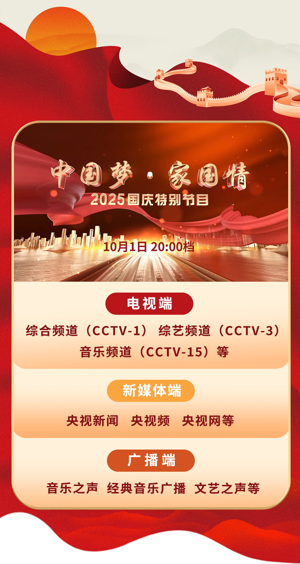 中秋遇國慶,家國兩相依。在即將到來的八天長假,中央廣播電視總臺帶著滿滿的心意和創(chuàng)意,打造多檔特別節(jié)目,推出一系列大劇大作,禮贊祖國、共享團圓,與您一同開啟繽紛多彩的假日時光!
