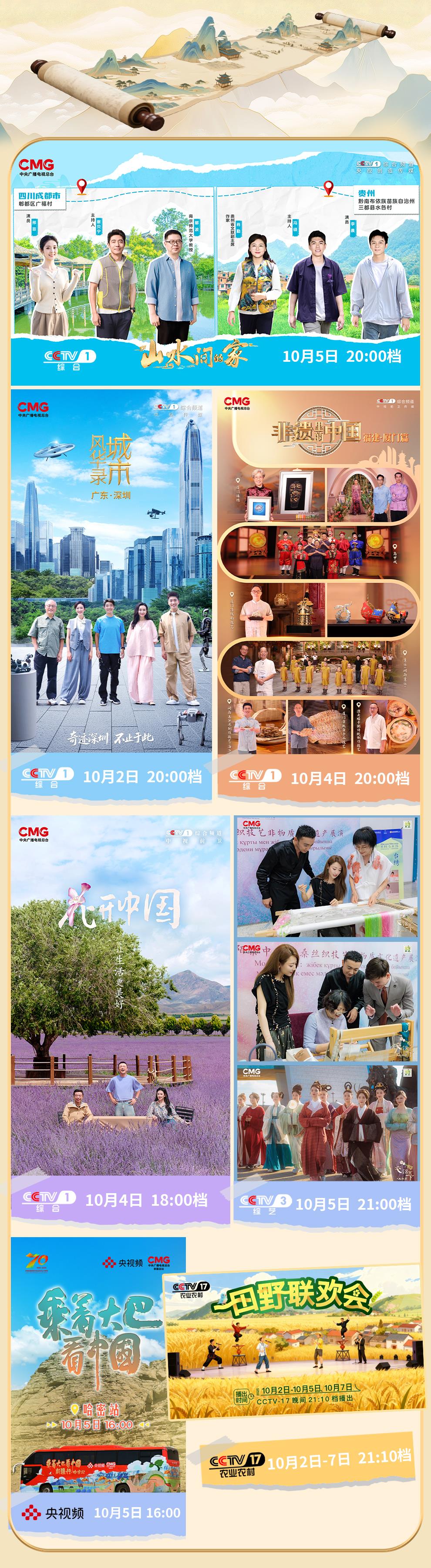 八天假期,想好去哪兒玩了嗎?來,跟著總臺去打卡!頭兩站:四川、貴州!《山水間的家(第四季)》“山水小分隊”邀你在川西林盤探韭香產(chǎn)業(yè),在黔南山鄉(xiāng)看巖椒成林。第三站:廣東。《城市風(fēng)華錄》帶你去深圳探訪全球首家機器人6S店,感受“奇跡之城”向新向好的澎湃動力。第四站:福建。珠繡、漆線雕、閩南童謠、高甲戲……看《非遺里的中國》,領(lǐng)略廈門非遺之美。第五站:新疆。從《花開中國》開啟一場跨越天山的芬芳之旅,在《衣錦天下 絲路季》發(fā)現(xiàn)絲綢之路上的中國審美,《乘著大巴游中國》探尋哈密甜美密碼。第六站:內(nèi)蒙古。在通遼參加《田野聯(lián)歡會》,體驗鄉(xiāng)土文化新活力。這八天的旅程,你不會錯過雄奇的風(fēng)光、古老的文化、新奇的創(chuàng)造,還有熱氣騰騰的生活。