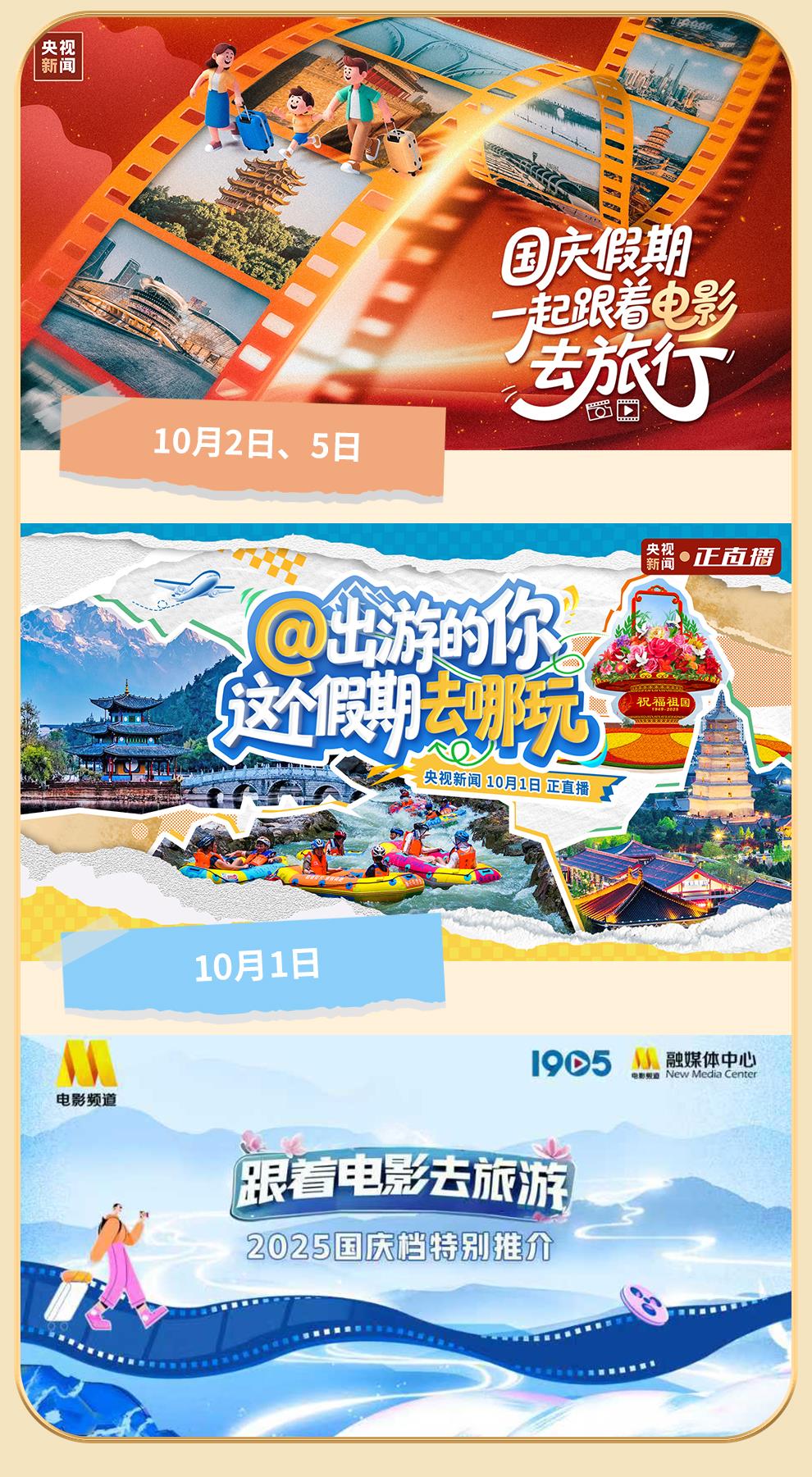 《國慶假期 一起跟著電影去旅行》《@出游的你 這個假期去哪玩?》還為大家策劃了第七站、第八站……準(zhǔn)備好出發(fā)了嗎?