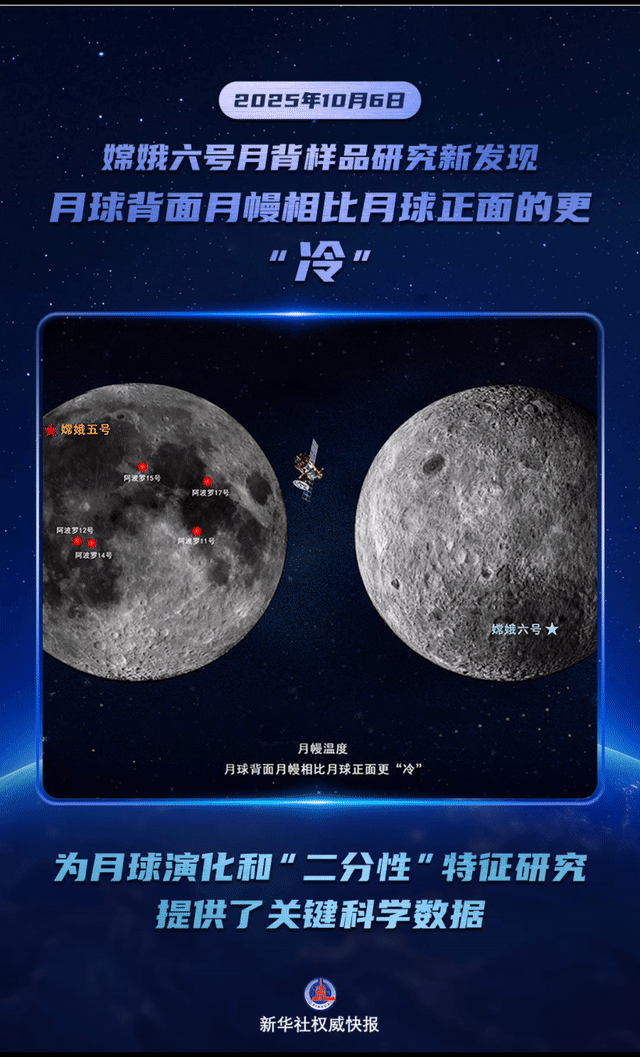 10月6日,時(shí)值中秋佳節(jié),國(guó)家航天局和國(guó)家原子能機(jī)構(gòu)聯(lián)合發(fā)布嫦娥六號(hào)月球背面樣品研究最新成果。我國(guó)科學(xué)家首次基于嫦娥六號(hào)月球背面樣品(月壤)研究發(fā)現(xiàn),月球背面月幔相比月球正面的更“冷”。