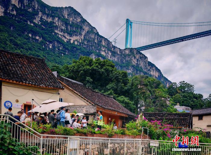 在花江村,記者看到不少游客悠閑地坐在青瓦灰墻的布依族傳統(tǒng)民居前品茶觀橋,或在村口的路邊尋找最佳角度,留下“與大橋同框”的紀(jì)念照;更有游客信步走向村邊的花江鐵索橋,尋找角度拍攝這座曾是黔滇往來要道的古橋,與遠(yuǎn)處現(xiàn)代工程的杰作形成“新老同框”的獨特畫面。