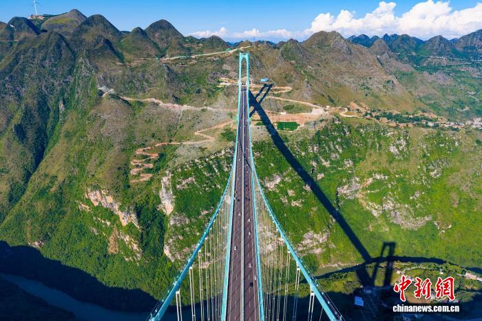 該橋主橋跨徑居山區(qū)橋梁跨徑世界第一、橋梁高度居世界第一。眾多游客慕名前來,或踏上透明玻璃步道體驗“云端漫步”,或在大橋觀景平臺、周邊村寨尋找最佳角度,與這座“橫豎都是世界第一”的大橋合影留念。