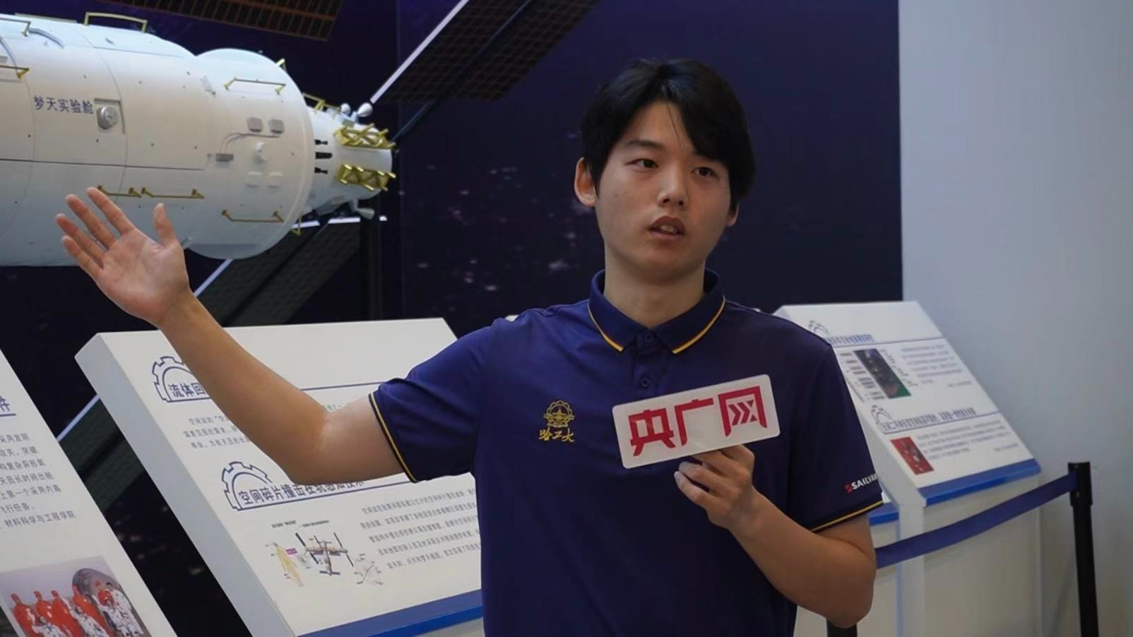 學生講解員郭鎮(zhèn)宇介紹由哈工大參與研制的問天實驗艙小機械臂(央廣網(wǎng)發(fā) 王語詩 攝)
