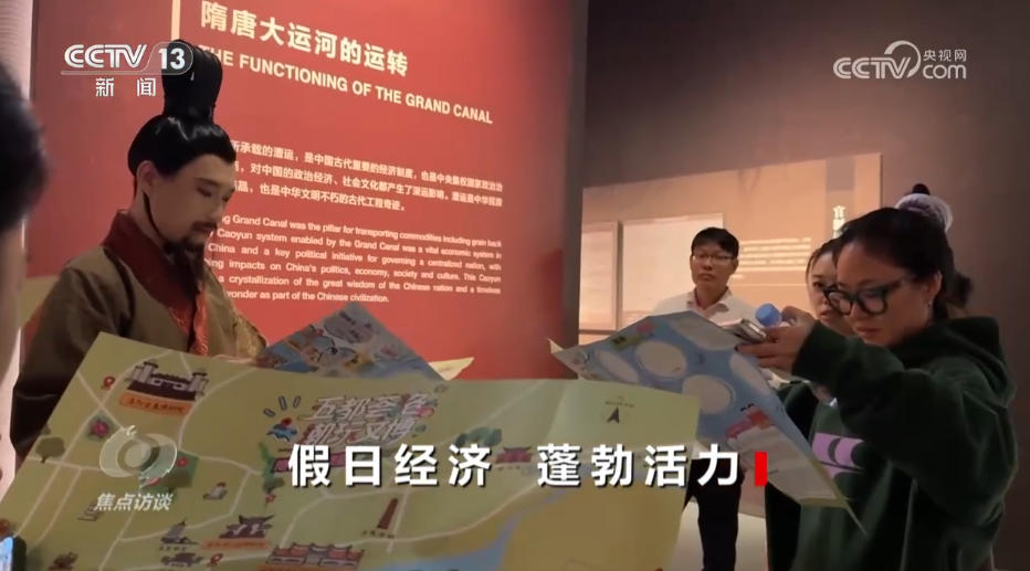 在河南洛陽的隋唐大運河文化博物館,一位身穿古裝的角色扮演者突然走向游客,簡單自我介紹后,將特制的文博地圖送到大家手中,并邀請眾人一起漫步展廳,沉浸式探尋大運河的前世今生。