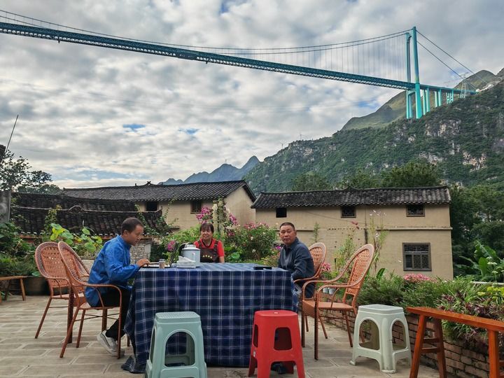 2025年9月27日,在貴州花江峽谷大橋附近,林國(guó)權(quán)(左)在自家民宿和員工坐在一起交流。新華社記者 向定杰 攝
