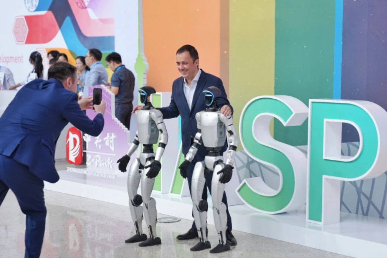 2025年9月17日,國(guó)際科技園及創(chuàng)新區(qū)域協(xié)會(huì)(IASP)2025年世界大會(huì)在北京國(guó)家會(huì)議中心開幕。圖為外籍嘉賓在大會(huì)現(xiàn)場(chǎng)同機(jī)器人合影。中新社記者 張祥毅 攝