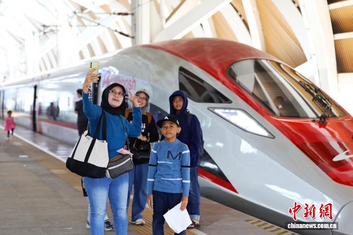 當?shù)貢r間6月26日,旅客在印尼雅加達哈利姆高鐵站與列車合影。雅萬高鐵由中印尼兩國合作建設,最高運營時速350公里?!≈行律缬浾?李志全 攝