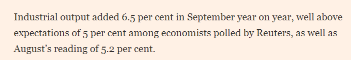 英國《金融時(shí)報(bào)》的文章分析說,9月規(guī)模以上工業(yè)增加值同比增長6.5%,顯著高于路透社調(diào)查經(jīng)濟(jì)學(xué)家預(yù)期的5%及8月的5.2%。荷蘭國際集團(tuán)(ING)經(jīng)濟(jì)學(xué)家分析稱,超預(yù)期表現(xiàn)主要源于外需拉動(dòng)。文章說,上周,海關(guān)數(shù)據(jù)顯示,中國出口保持韌性,9月同比增長8.3%,對(duì)東南亞等地區(qū)出口持續(xù)增長。