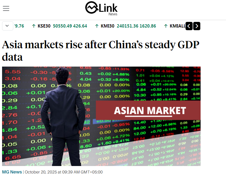 巴基斯坦金融網(wǎng)站Mettis Global Link發(fā)表題為《亞洲股市響應(yīng)中國穩(wěn)健GDP數(shù)據(jù)普漲》的文章。文章分析稱,亞洲市場20日迎來開門紅,得益于中國的最新經(jīng)濟(jì)數(shù)據(jù)。中國第三季度GDP同比增長4.8%,同時(shí)維持貸款市場報(bào)價(jià)利率(LPR)。股市方面,香港恒生指數(shù)大漲逾2%,內(nèi)地滬深300指數(shù)上漲0.74%。日經(jīng)225指數(shù)飆升近3%,首次突破49000點(diǎn)大關(guān),東證指數(shù)上漲2%。