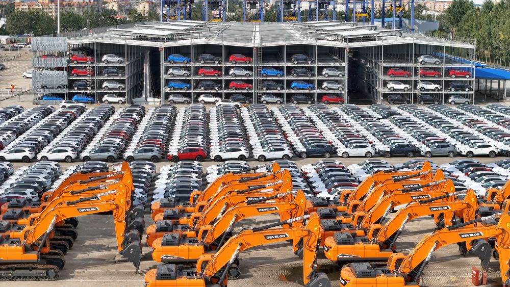 10月20日,國產(chǎn)汽車和工程機械在山東港口煙臺港集結(jié)等待裝船出口(無人機照片)。新華社發(fā)(唐克 攝)