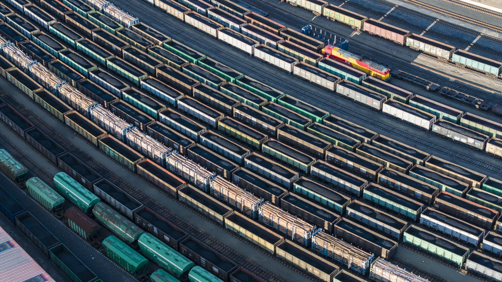 2025年10月18日,在中國(guó)鐵路哈爾濱局集團(tuán)有限公司綏芬河站南場(chǎng),滿載進(jìn)口貨物的列車(chē)等待解體換裝(無(wú)人機(jī)照片)。新華社發(fā)(曲藝偉 攝)