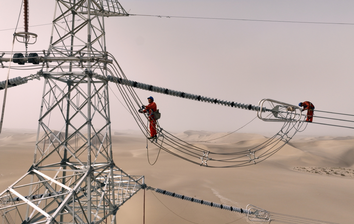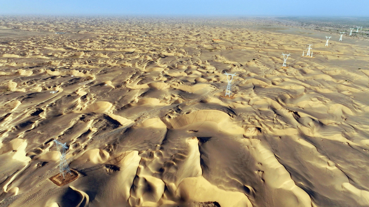 2025年6月25日,民豐—且末—若羌750千伏輸電線(xiàn)路工程穿越“死亡之?!彼死敻缮衬?。(馬元 攝)