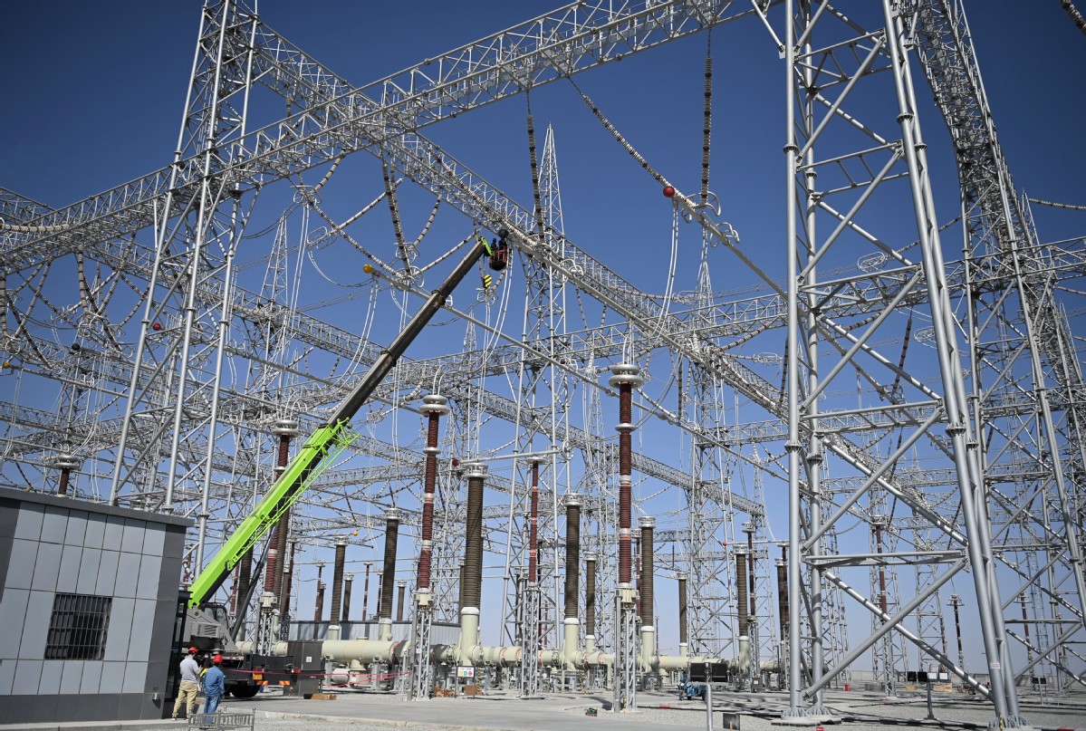 2025年9月28日,且末750千伏變電站新建工程建設(shè)現(xiàn)場(chǎng),作業(yè)人員對(duì)管母金具進(jìn)行檢查復(fù)驗(yàn)。(馬元 攝)
