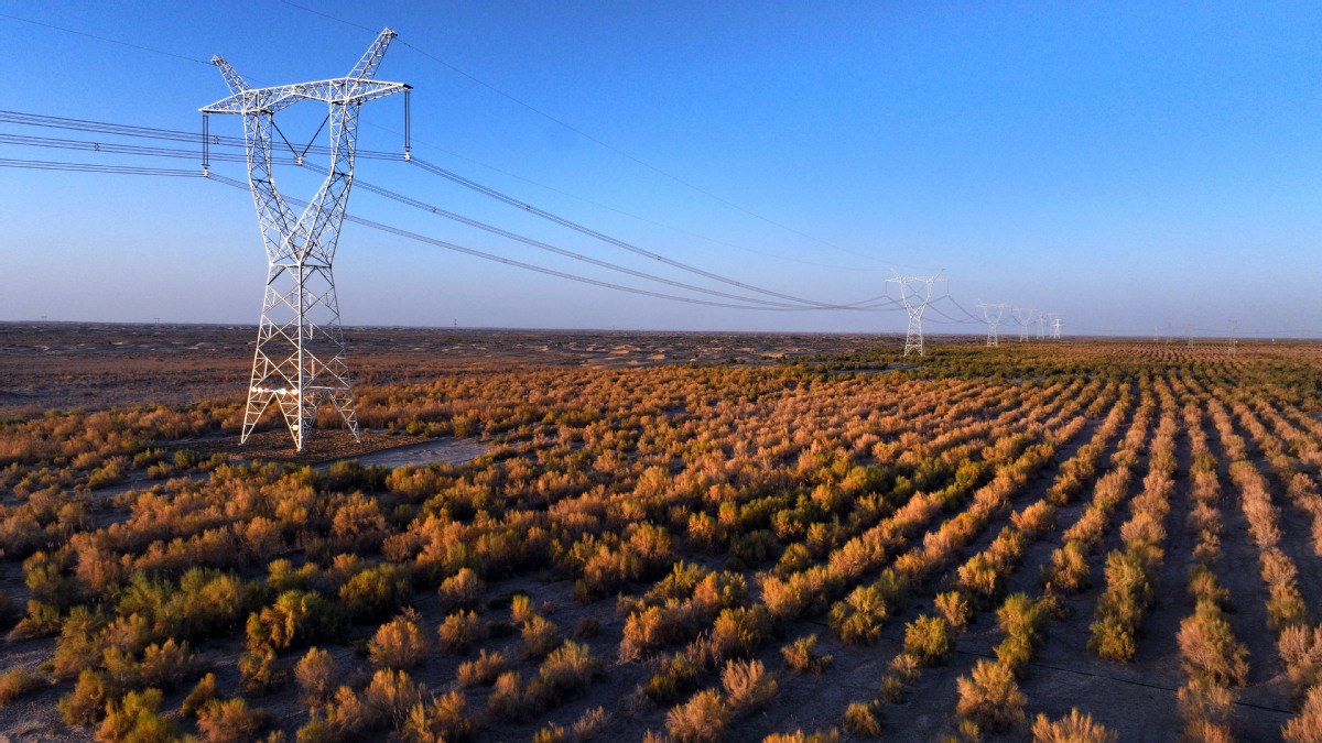 2025年10月18日,民豐—且末—若羌750千伏輸電線(xiàn)路工程與胡楊林和諧共處。(馬元 攝)