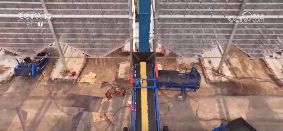 烘干后的玉米去哪里了?大家抬頭看,答案在樓頂上這些高速傳送帶,玉米通過傳送帶進(jìn)入下一個加工區(qū)。