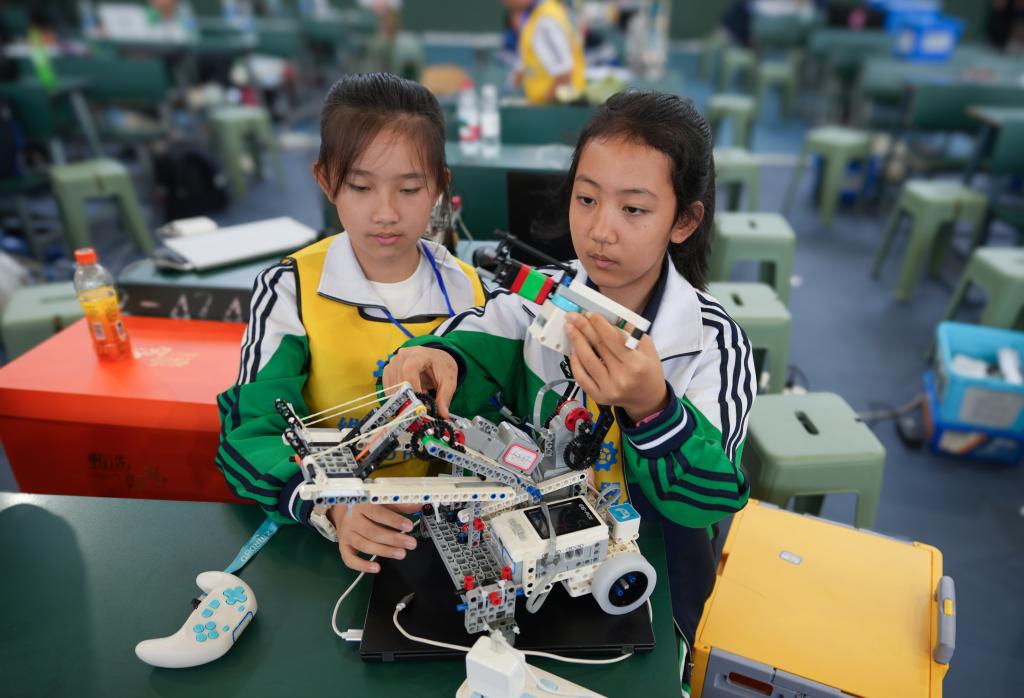 5月31日,兩名參賽選手在全國青少年科技教育成果展示大賽云南省區(qū)域賽上調(diào)試比賽用的機(jī)器人。新華社記者 陳欣波 攝