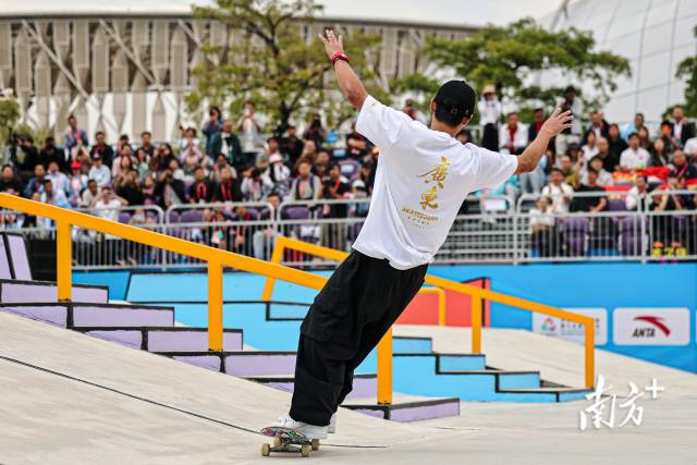 11月11日下午,十五運(yùn)會(huì)滑板項(xiàng)目男子街式?jīng)Q賽,廣東隊(duì)潘家杰完成高難度動(dòng)作后展開雙臂與歡呼的觀眾們互動(dòng)。鄭新洽 攝