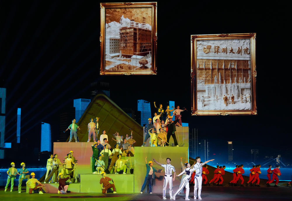 舞臺(tái)上,象征改革開放歷程的建設(shè)者們接力登場,劈山跨海,筑路架橋。他們帶著夢想南下,以敢闖敢試、敢為人先、埋頭苦干的特區(qū)精神,闖出一片新天地。