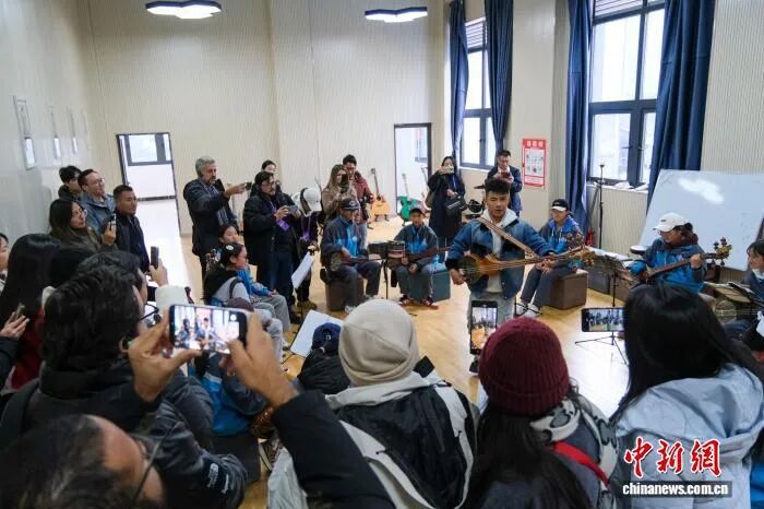 10月28日,拉美18個(gè)國家的21名記者、編輯等媒體從業(yè)者在西藏自治區(qū)林芝市巴宜區(qū)中學(xué)參訪,觀看師生們演奏藏族扎念琴。 中新社記者 江飛波 攝