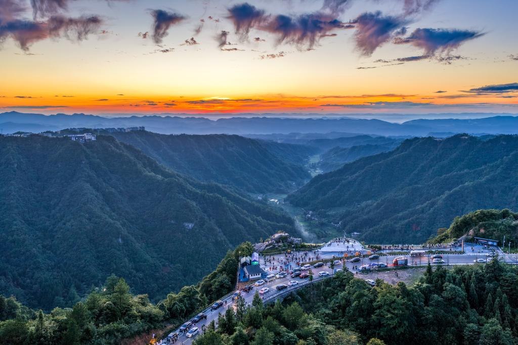 2025年8月20日,游客在重慶市石柱縣黃水鎮(zhèn)環(huán)湖路觀景臺(tái)欣賞晚霞景色(無(wú)人機(jī)照片)。新華社記者 唐奕 攝