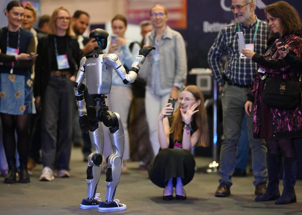 2025年11月12日,在葡萄牙里斯本,中國(guó)企業(yè)宇樹科技的人形機(jī)器人和與會(huì)者在2025年網(wǎng)絡(luò)峰會(huì)現(xiàn)場(chǎng)互動(dòng)。新華社發(fā)