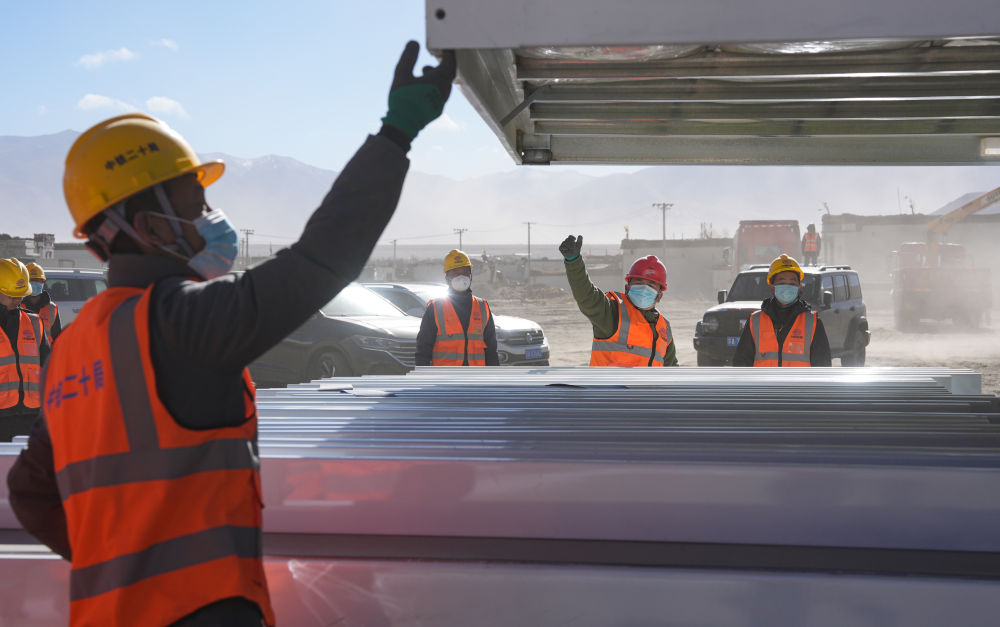 2025年1月9日,工作人員在定日縣長所鄉(xiāng)森嘎村搭建板房。