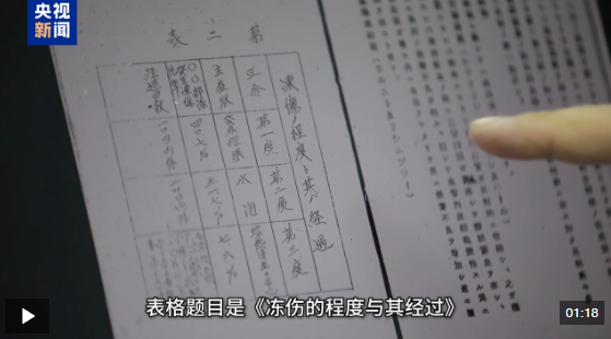 侵華日軍第七三一部隊罪證陳列館研究人員 譚天:這就是論文里的一張表格。表格題目是《凍傷的程度與其經(jīng)過》。第一度,發(fā)紅腫脹,第二度,出現(xiàn)水皰,第三度,壞死,含潰瘍。第三度,它這里頭寫五十到六十天,腳趾、手指脫落。無疑,這是經(jīng)過大量人體實驗,得到的所謂的數(shù)據(jù)。