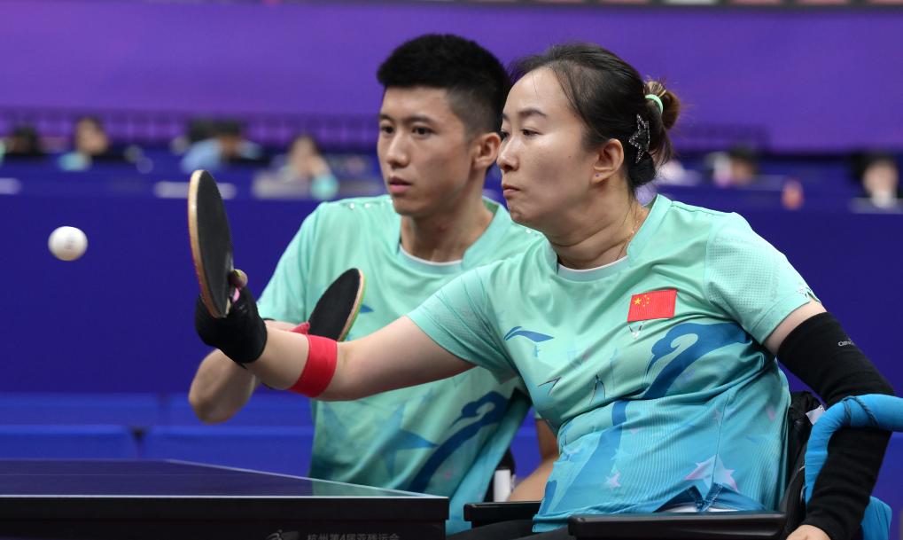 圖為2023年10月26日,毛淋(前)和隊(duì)友翟翔在杭州第4屆亞殘運(yùn)會(huì)乒乓球混合雙打4級(jí)B組的比賽中。新華社記者 李賀 攝