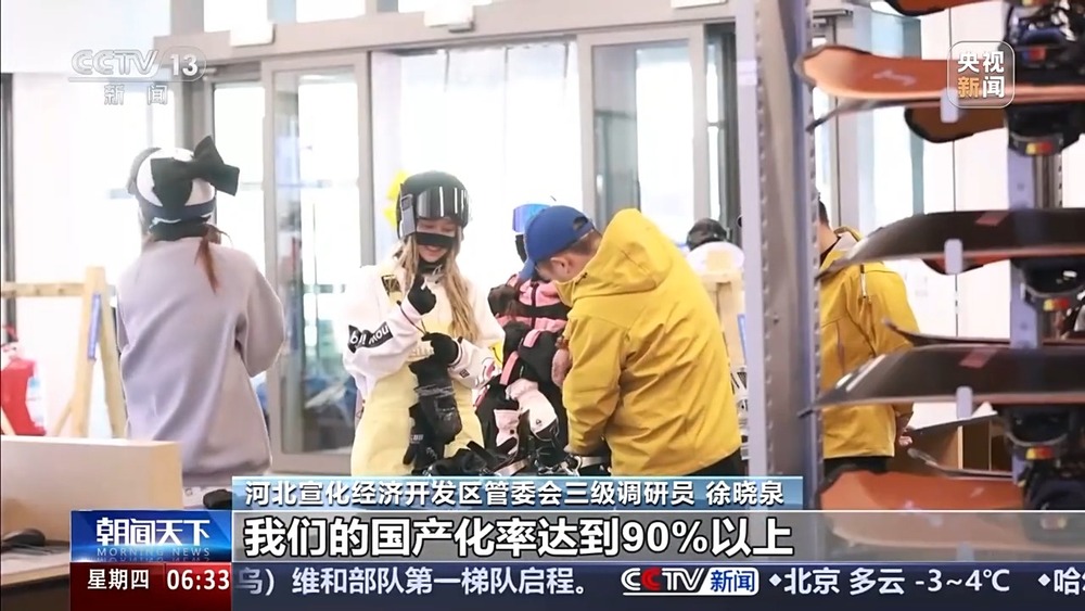 總臺(tái)央視記者 杜思源:冰雪產(chǎn)業(yè),從造雪制冰開始,到滑雪場(chǎng)的纜車、壓雪車等設(shè)施,再到我們使用的雪服雪板等等,涉及的門類繁多。推動(dòng)冰雪經(jīng)濟(jì)高質(zhì)量發(fā)展,不同產(chǎn)線的協(xié)作、區(qū)域間的高效協(xié)同,至關(guān)重要。我現(xiàn)在是在河北崇禮的一家滑雪場(chǎng),距離這里一個(gè)小時(shí)車程,就是當(dāng)?shù)氐谋┊a(chǎn)業(yè)園。在京津冀地區(qū)的多個(gè)雪場(chǎng),都有來自這座產(chǎn)業(yè)園的冰雪裝備。