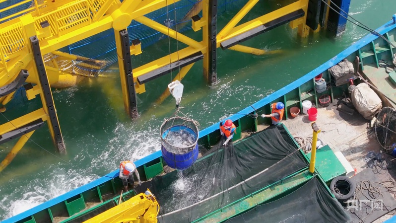 “龍宮號”工作人員將魚打撈上船(央廣網(wǎng)記者 徐鋇兒 攝)