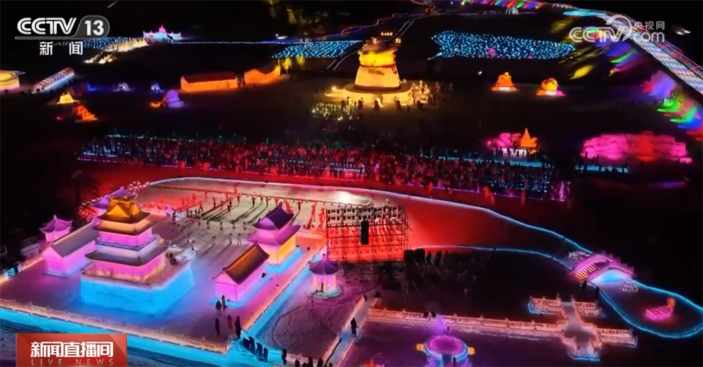 臨近零點(diǎn),一場(chǎng)融合科技光影與民族歌舞的跨年演出在晶瑩閃爍的冰雕舞臺(tái)上精彩亮相。