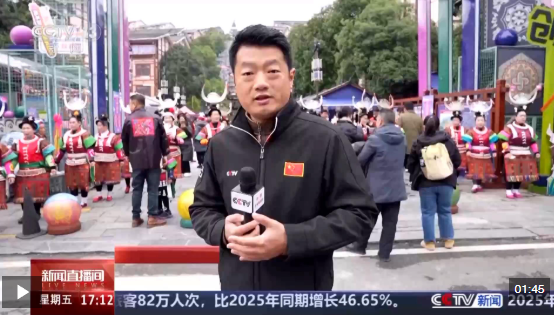 總臺記者 尹平:在位于貴州省黔東南州凱里市的繡里淘非遺集市門口,當?shù)厝罕姶灯鹛J笙,擺起攔門酒,用自己豐富多彩的民族文化和琳瑯滿目的非遺技藝迎接新年,歡迎大家來過新年。