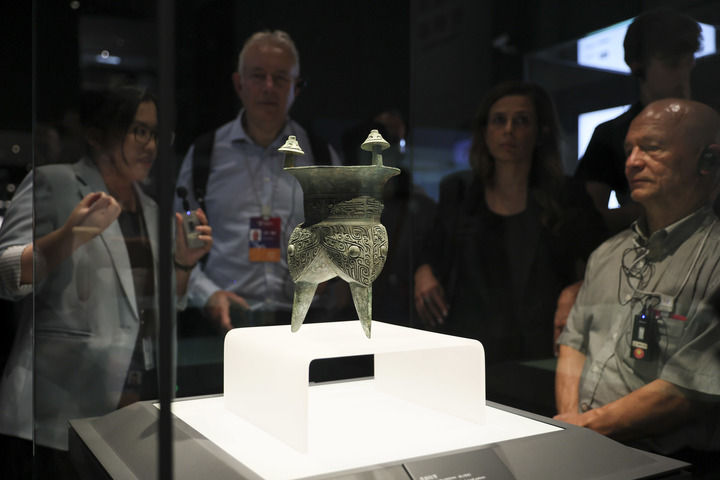 2025年10月13日,第二屆世界中國學(xué)大會(huì)“中國式現(xiàn)代化”主題參訪活動(dòng)嘉賓在上海博物館東館青銅館參觀。新華社記者 王翔 攝