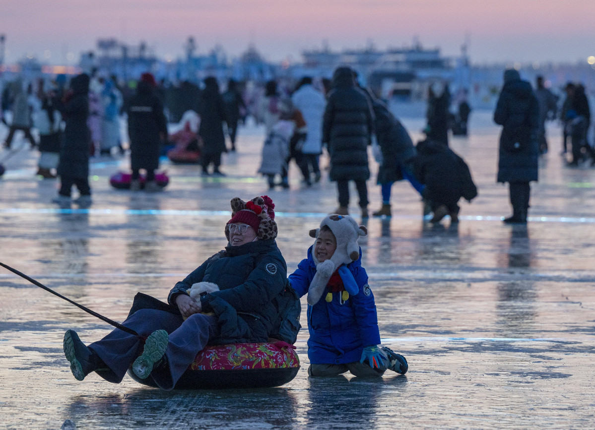 1月2日,人們?cè)诘诎藢霉枮I松花江冰雪嘉年華園區(qū)內(nèi)體驗(yàn)冰上娛樂項(xiàng)目。(圖片來源:新華社)
