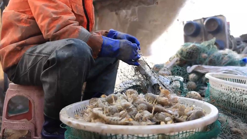 在無棣縣埕口鎮(zhèn),漁民清晨便駕船出海。隨著漁網(wǎng)收起,一只只活蹦亂跳的琵琶蝦躍上甲板。漁民隨即進行分揀、清洗和裝筐。