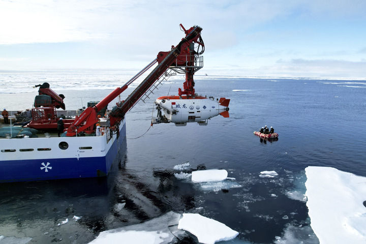 2025年8月11日,“蛟龍”號在北極冰區(qū)準備下潛。新華社記者 劉詩平 攝