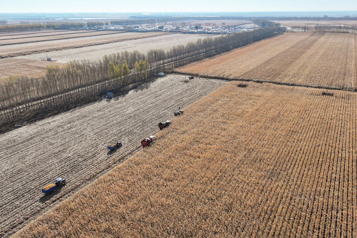 2024年10月16日,在黑龍江省肇東市五里明鎮(zhèn)東升村,農民駕駛農機進行收割作業(yè)(無人機照片)。新華社記者 謝劍飛 攝