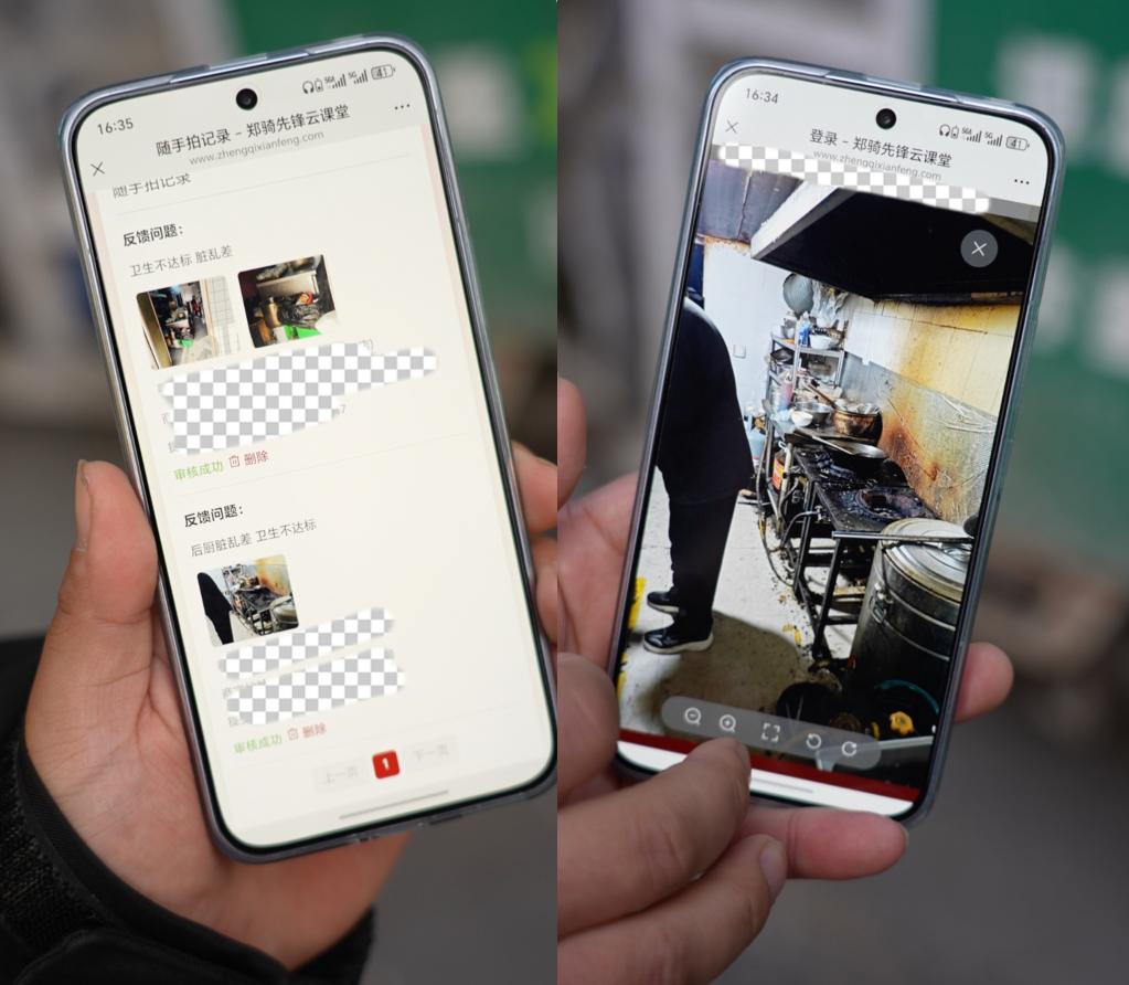 圖為騎手展示的“鄭騎先鋒隨手拍”手機(jī)操作頁面(拼版照片)。新華社記者 孫清清 攝