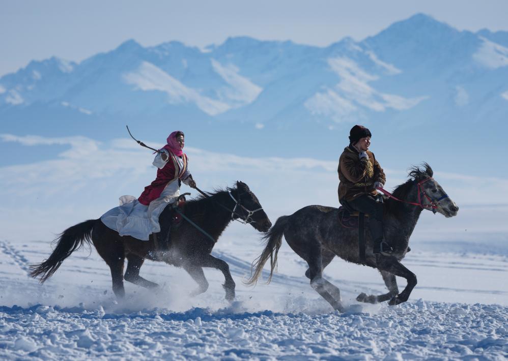 西陲天山,雪峰逶迤。被譽為“天馬故鄉(xiāng)”的新疆伊犁昭蘇縣,在南腔北調(diào)的歡呼聲中,演員們騎馬行進(jìn)在銀裝素裹的濕地公園,載歌載舞表演牧區(qū)傳統(tǒng)婚禮。興之所起,游客與演員共舞一曲,熱鬧非凡。