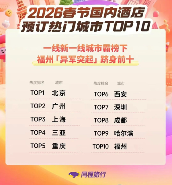 同程旅行數(shù)據(jù)顯示,春節(jié)國內(nèi)酒店預訂熱門城市TOP10榜單,基本被一線、新一線城市霸榜,但“國家歷史文化名城”福建福州闖出一席之地,躋身第10名。2025年,三坊七巷、煙臺山、上下杭等3個街區(qū)全年接待游客超5500萬人次,創(chuàng)歷史新高。