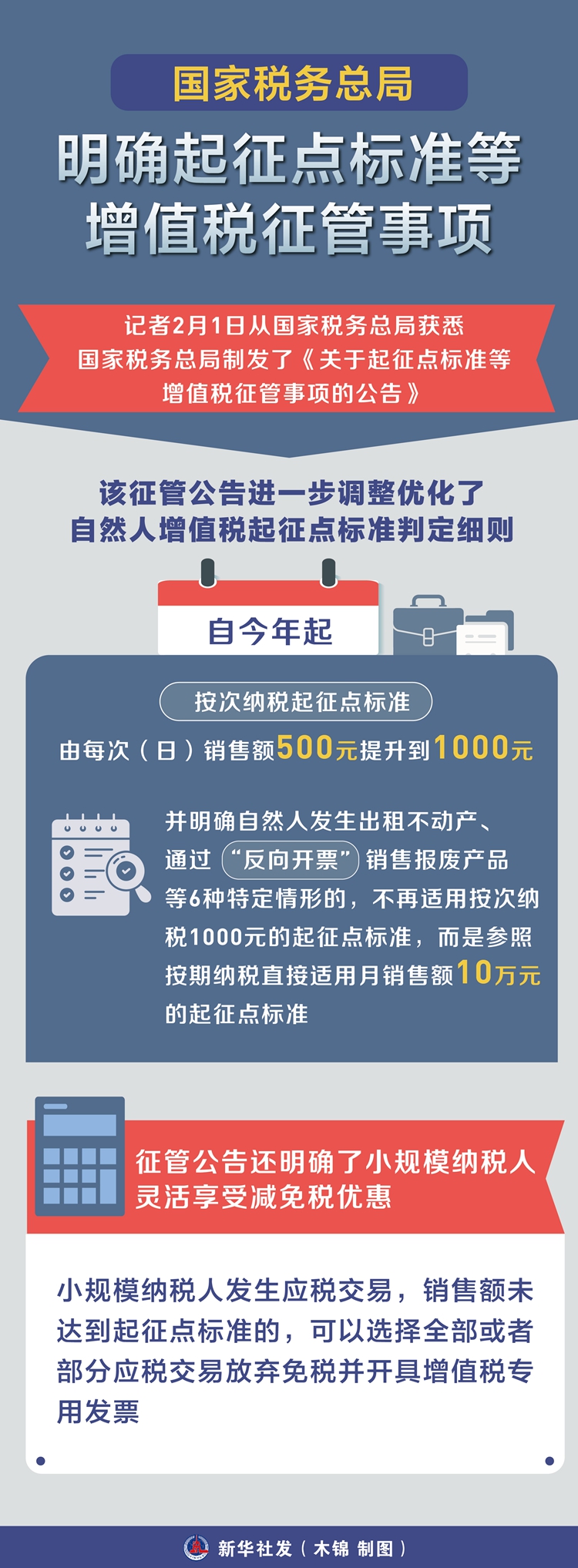 記者2月1日從國家稅務總局獲悉,國家稅務總局制發(fā)了《關于起征點標準等增值稅征管事項的公告》,就起征點標準判定、稅收優(yōu)惠政策適用等增值稅征管事項作了進一步明確,細化操作要求,推動增值稅法及其實施條例落實落地。
