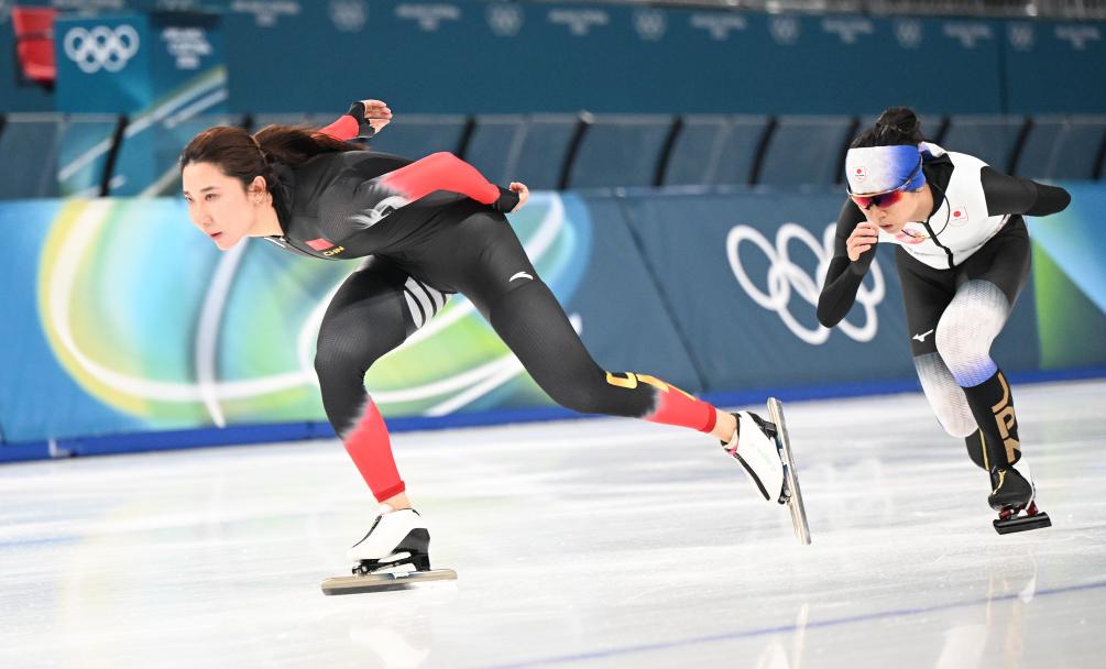 2月5日,中國運動員韓梅(左)和日本運動員高木美帆在訓(xùn)練中。新華社記者 武巍 攝