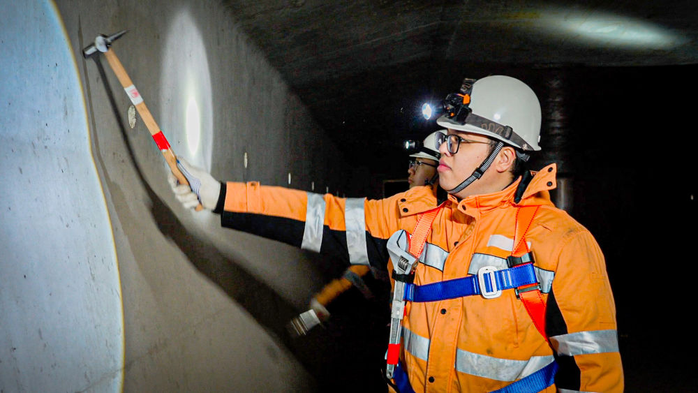 橋體間的縫隙狹窄,進入大橋內部后更是伸手不見五指。上海高鐵基礎設施段湖州車間橋梁組工作人員借著頭燈的光線,像啄木鳥為樹木問診一般,沿梁體一路進行聽診式的檢查。