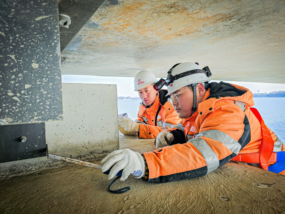 春運期間,上海高鐵基礎設施段湖州車間橋梁組工作人員在滬蘇湖高鐵元蕩湖段進行檢修作業(yè)。