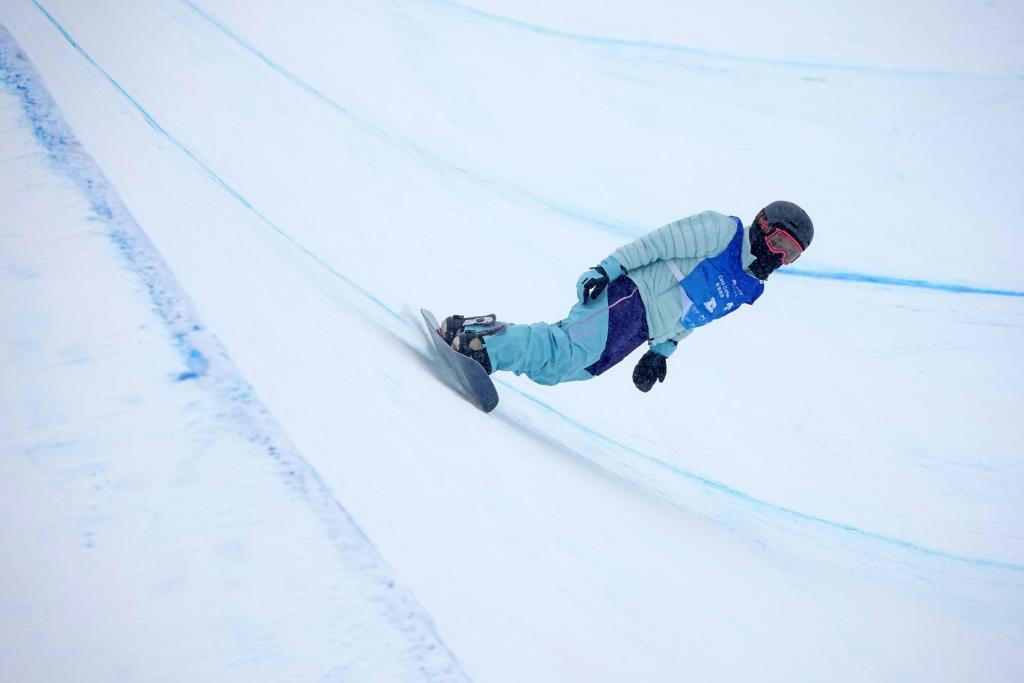 2025年12月12日,中國選手蔡雪桐在比賽中。當(dāng)日,單板滑雪U型場地技巧世界杯女子組決賽在河北省張家口市崇禮區(qū)舉行。新華社記者 王鵬 攝