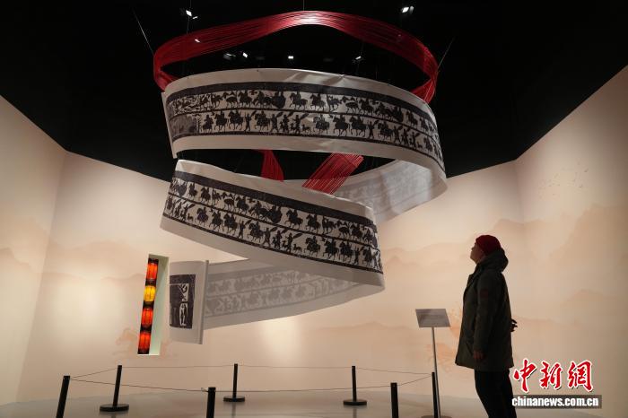 2月19日,安徽博物院展出的以漢代車馬出行拓片圖為核心創(chuàng)作的藝術(shù)裝置。中新社記者 張俊 攝