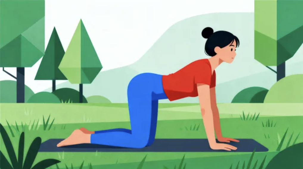 1.懶貓弓背:跪姿,雙手雙膝撐地,手腕對齊肩膀,膝蓋對齊,保持背部平直;吸氣,抬頭塌腰,腹部下沉、臀部上翹,感受肩背腰部拉伸;呼氣,低頭拱背,下巴盡量靠近鎖骨,感受背部肌肉收縮,重復5-8次。